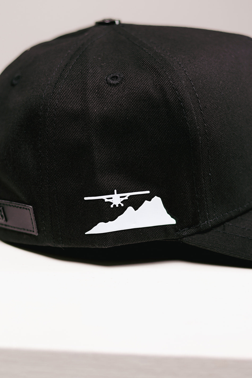 Una gorra snapback en color negro, minimalista y con estilo urbano, que luce un bordado frontal sutil con el diseño de una avioneta. Ofrece una forma estructurada y ajuste trasero tipo snapback, ideal para un look limpio y versátil.